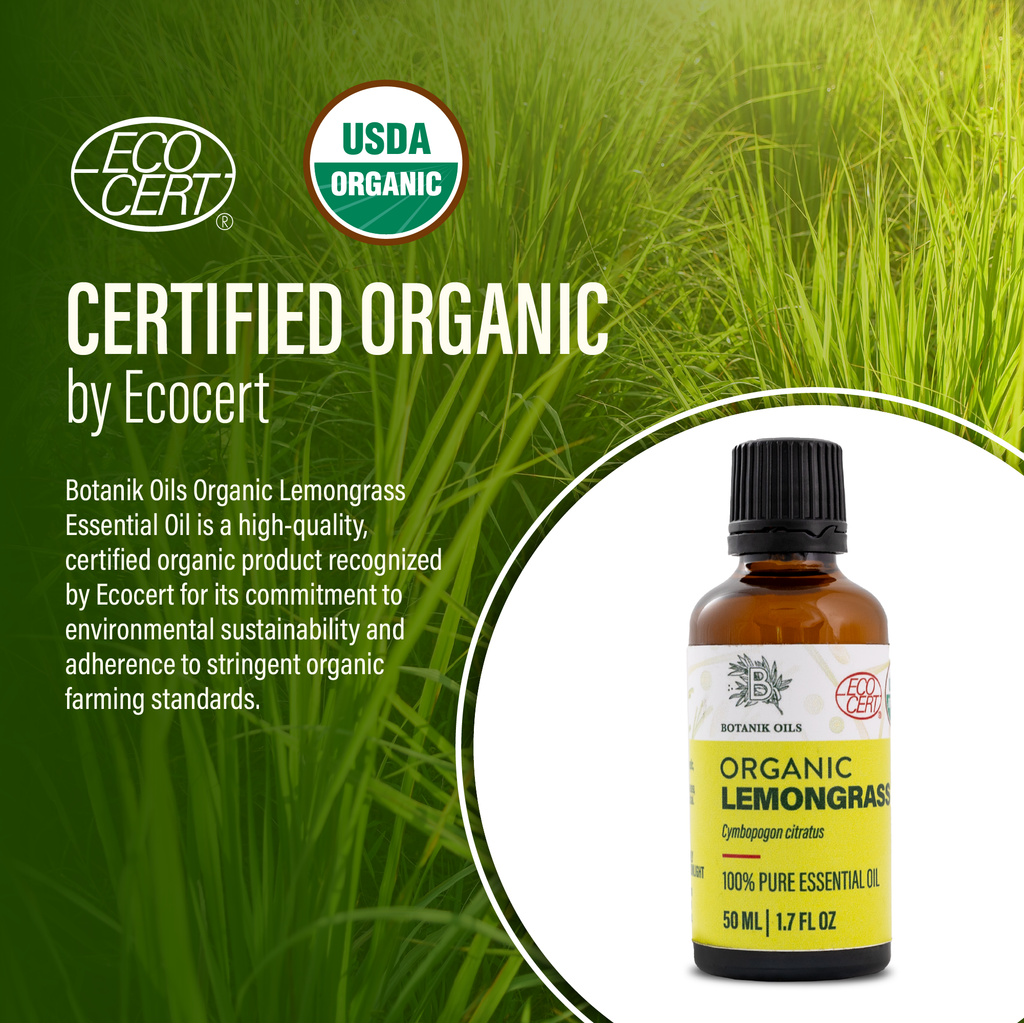 Botanik Oils Organic Lemongrass Essential Oil is a premium, certified organic product proudly recognized by Ecocert for its dedication to environmental sustainability and strict compliance with rigorous organic farming standards. This essential oil is carefully extracted through steam distillation from fresh leaves of Cymbopogon citratus, a fragrant tropical grass prized for its vibrant, uplifting aroma and numerous therapeutic benefits.